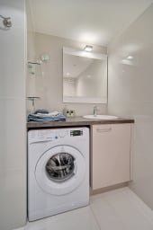 The kitchen is fully equipped with a dishwasher, microwave, fridge, freezer, and electric cooktop – everything you need if you prefer to cook at home instead of dining out. The bathroom with shower, includes a washing machine, making longer stays easy and convenient.
