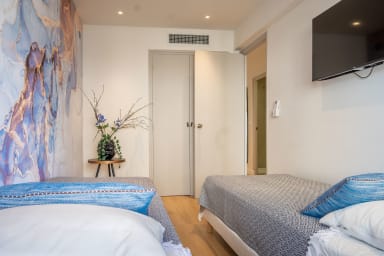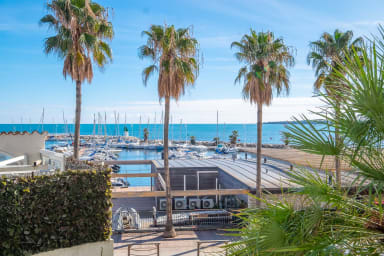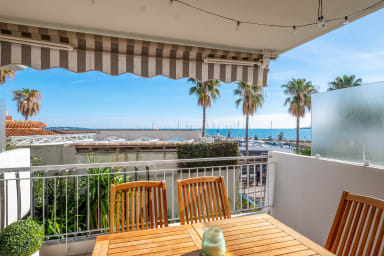 The apartment is located in the sought-after area of Pointe Croisette (also known as Palm Beach), directly opposite Plage Moure Rouge. This is a quieter part of Cannes with easy access to beaches, seaside promenades, local restaurants and shops. The beach is public and free of charge, with ample space even during high season. The water is often calmer here than closer to the city centre, making it popular with locals and families.
