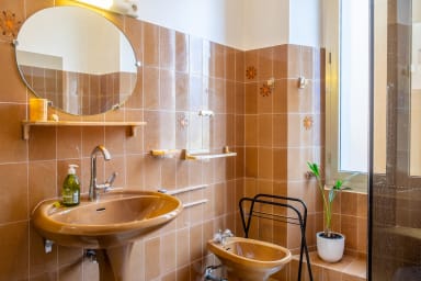 Två badrum varav ett med dusch och där finns även tvättmaskinen. Det andra badrummet har badkar och om du växte upp på 60-talet kommer du att känna igen dig i detta badrum i perfekt originalskick.