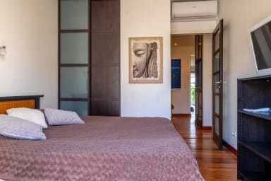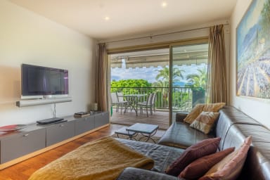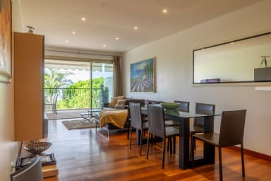 Lägenheten har en öppen planlösning med stora skjutdörrar mot en djup balkong i riktning mot La Croisette. Alla tre sovrum ligger på baksidan av huset i ett lugnare läge. Planlösningen består av ett sovrum med dubbelsäng, ett sovrum med två enkelsängar som står ihop som dubbelsäng (kan separeras), samt ett mindre praktiskt sovrum med två enkelsängar, lämpligt för barn eller gäster som främst behöver en bekväm plats att sova. Det fullt utrustade köket är integrerat med vardagsrummet och alla rum har A/C.